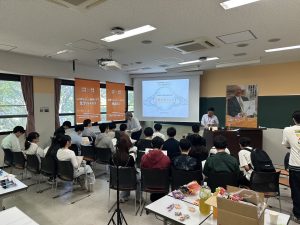 大学1年生向けの学部移行ガイダンスにて、多田准教授が応用化学コースおよび化学システム工学研究室の研究内容を紹介しました。